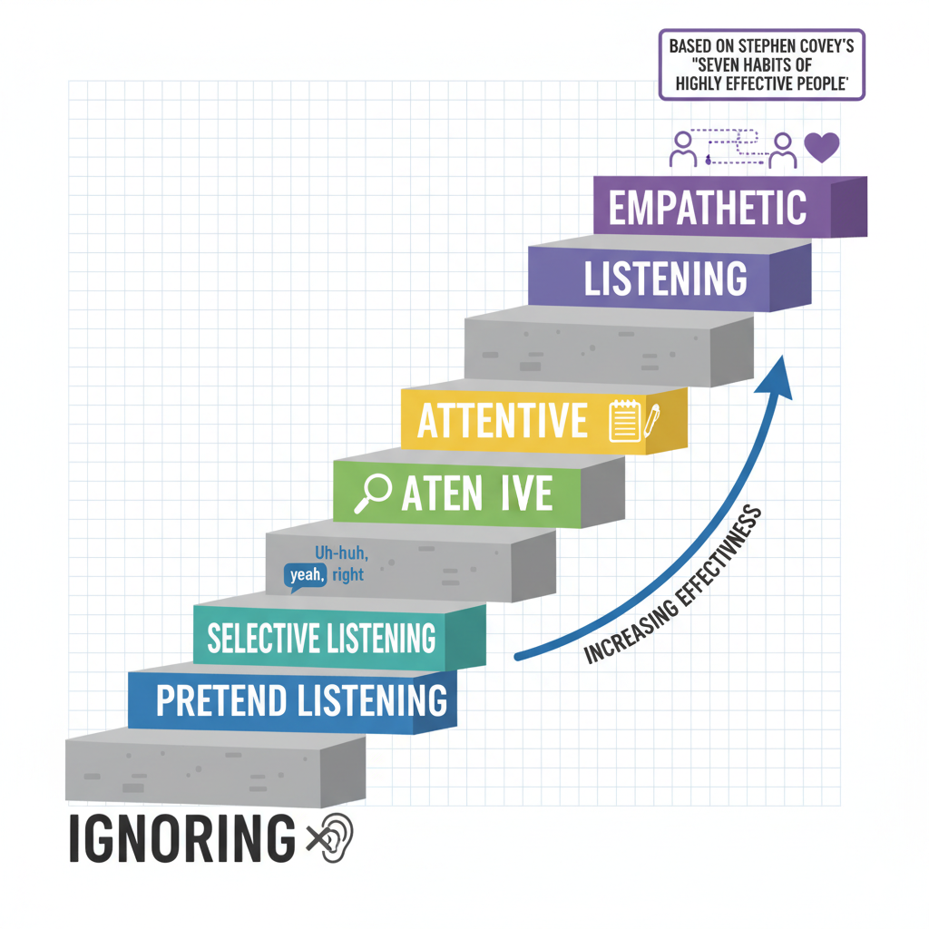 Listening is a fundamental skill essential for developing emotional intelligence. It helps build strong relationships, demonstrate empathy, and improve professional effectiveness, particularly in leadership and service roles. Here’s a closer look at the different levels of listening: