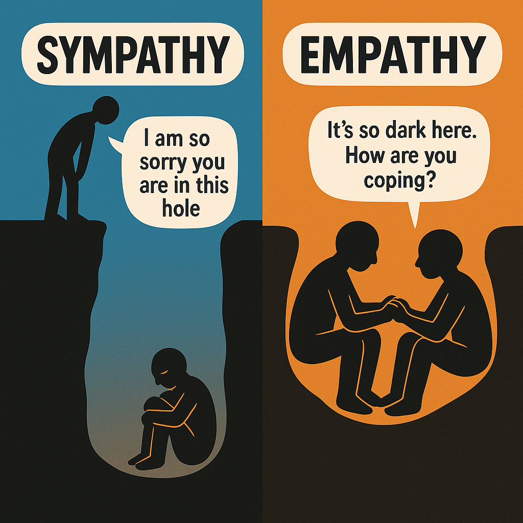 Sympathy, on the other hand, means feeling pity or sorrow for someone’s misfortune without necessarily experiencing their emotions. Sympathy can inadvertently create distance in a relationship.