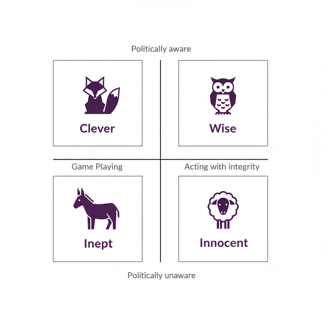 Workplace politics, often misunderstood, involve the dynamics of power and relationships in organizations. While it can have a negative connotation, constructive politics can promote collaboration and align efforts toward common goals. Not everyone is comming with integrity work and not every one is plotically aware, understanding different political "animals" in the workplace—sheep, donkeys, owls, and foxes—can help navigate these dynamics effectively.