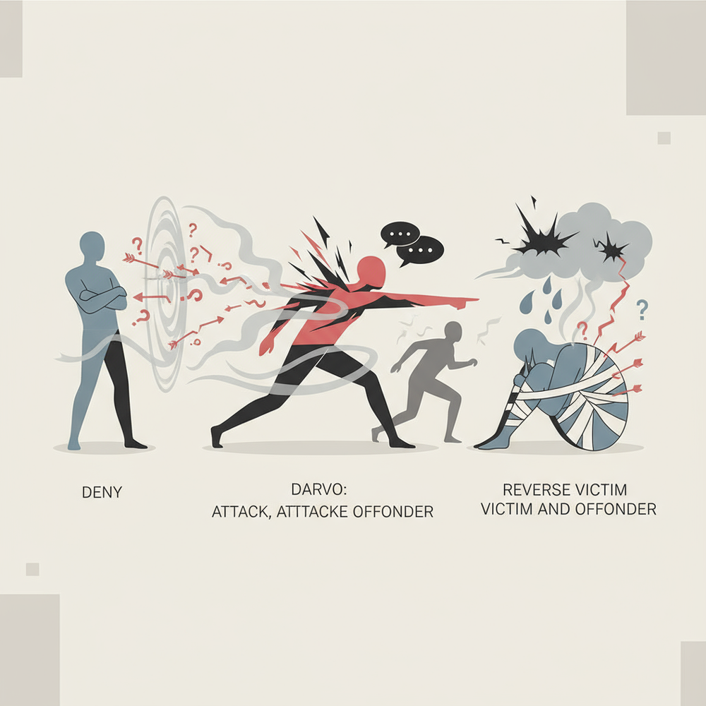 When encountering DARVO (Deny, Attack, and Reverse Victim and Offender), consider these steps: