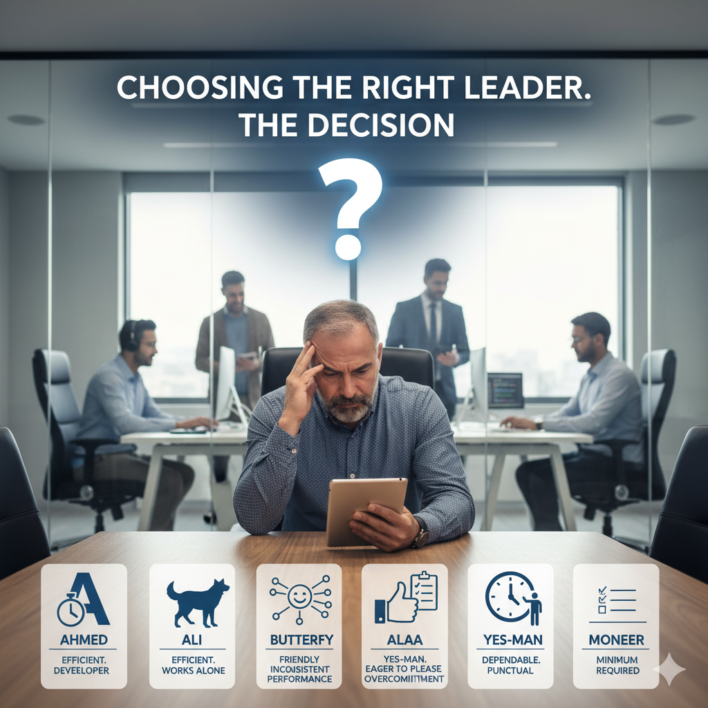 Now, dear reader, who do you think Essam should choose? The efficient but solitary Ahmed, the amiable yet underperforming Ali, the overly agreeable Alaa, or the reliable but unambitious Moneer?